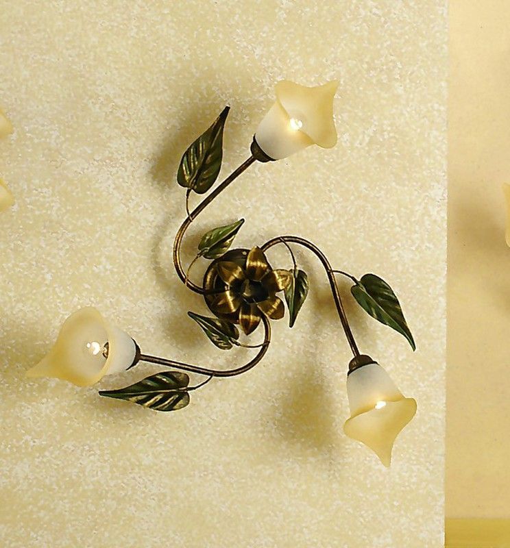 Plafón de 3 luces Serie MIRANDA con diseño floral y ramas metálicas en acabado dorado antiguo. Ideal para iluminar espacios como salones, dormitorios o pasillos con estilo clásico y elegante. Las pantallas de vidrio opalino difuminan la luz creando un ambiente cálido y acogedor. Fácil instalación en pared o techo.