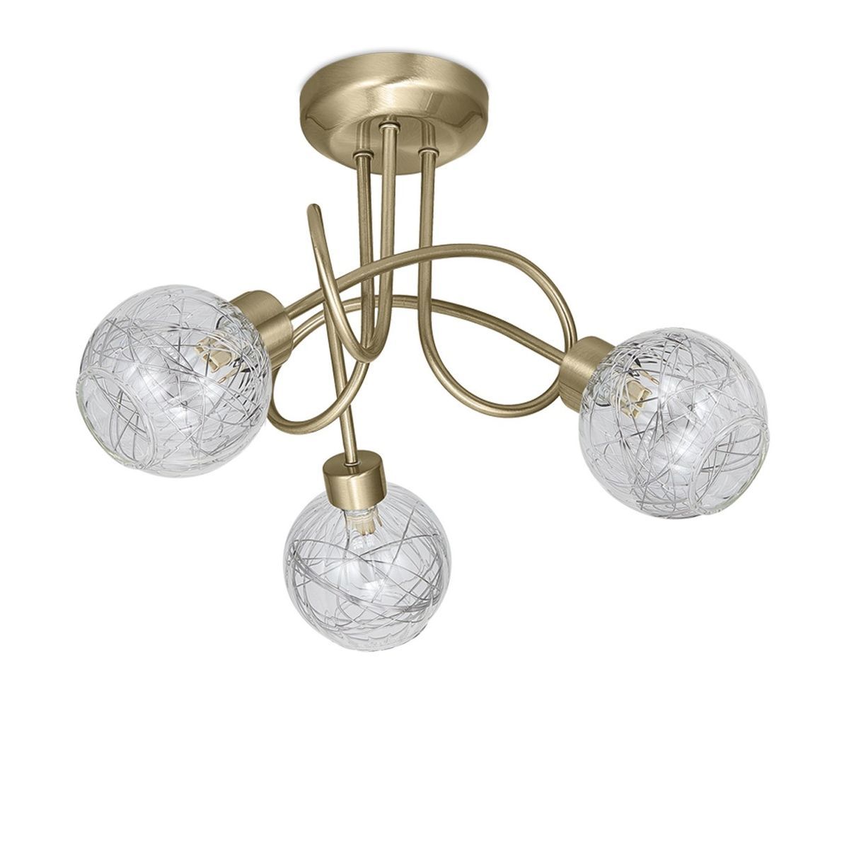 Plafón de techo con 3 luces esféricas de vidrio transparente con diseño de líneas entrelazadas, montado sobre estructura metálica en acabado dorado. Ideal para iluminar espacios como comedor, sala o pasillos con estilo moderno y elegante. Fácil instalación y diseño versátil para interiores contemporáneos.
