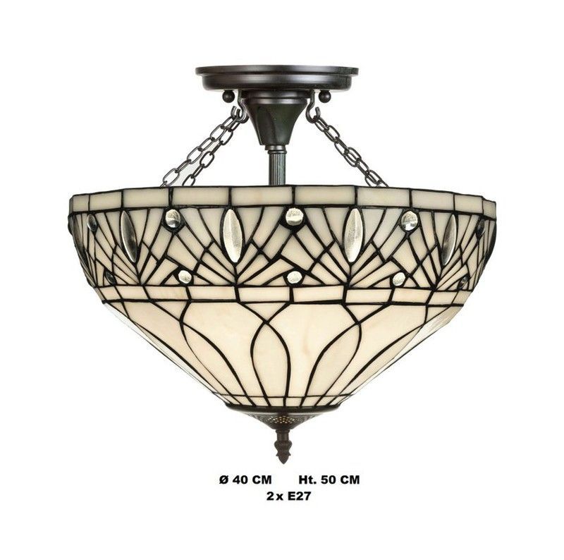 Plafón bajo estilo Tiffany con diseño elegante y clásico, ideal para iluminar espacios como comedor, pasillo o entrada. Fabricado con vidrio de colores crema y blanco con patrones geométricos y detalles en forma de hojas, montado sobre estructura metálica en acabado negro. Incluye cadenas de suspensión y soporte para 2 bombillas E27. Diámetro 40 cm