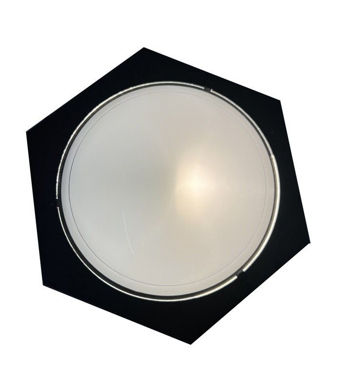Plafón de techo negro de 35 cm con diseño hexagonal y difusor circular blanco, ideal para iluminar espacios como salones, dormitorios o pasillos. Fabricado en metal y plástico, ofrece una luz suave y uniforme. Perfecto para interiores modernos y minimalistas.