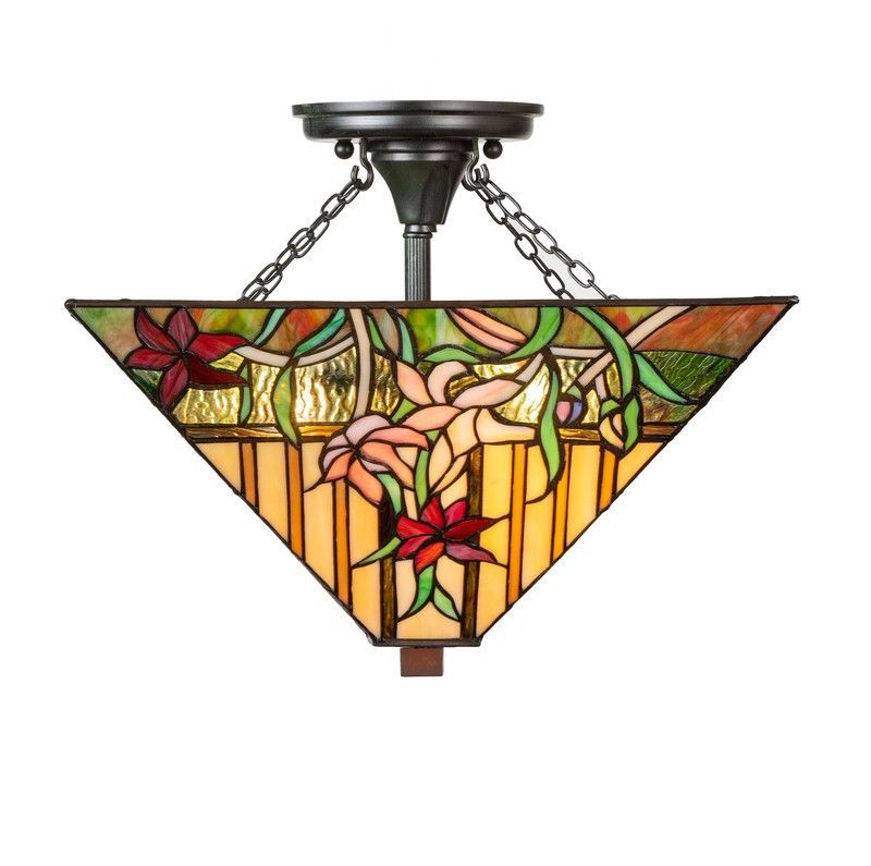 Plafón de techo Artistar NBS161512 con diseño de vitral en estilo Tiffany, ideal para espacios con encanto clásico. Fabricado con vidrio coloreado y estructura metálica en acabado negro, presenta un diseño floral con tonos cálidos y verdes. Perfecto para salones, comedores o pasillos. Incluye cadena de suspensión para ajuste de altura. Calidad dura