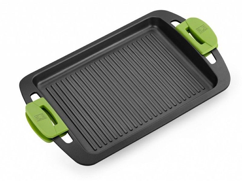Plancha para saltear de 40 cm con diseño rectangular y rayas para marcar la parrilla. Fabricada en acero inoxidable con superficie antiadherente y manijas verdes de plástico para un manejo seguro. Ideal para cocinar carnes, pescados y vegetales con un toque profesional en tu cocina. Resistente al calor y fácil de limpiar.