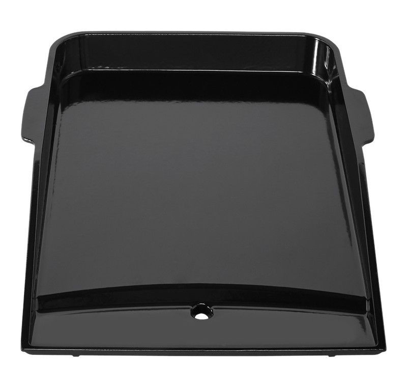 Plancha para barbacoa Weber Genesis II en acero inoxidable, acabado negro brillante. Diseño rectangular con bordes elevados y asas laterales para un manejo seguro. Incluye orificio de drenaje para una limpieza fácil. Ideal para cocinar a la parrilla con uniformidad y durabilidad. Perfecta para amantes de la barbacoa que buscan calidad y rendimiento