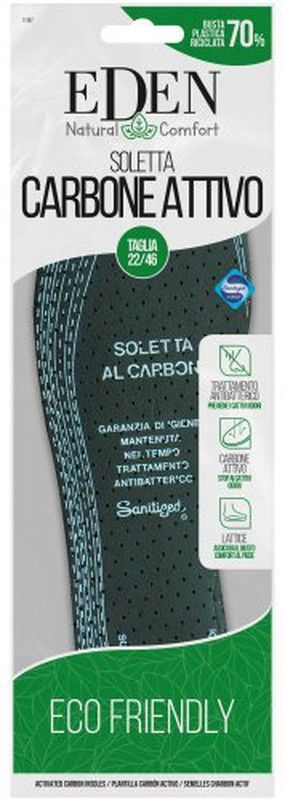 Plantilla Eco Friendly Carbon Activ de Eden, diseñada para adultos, con tecnología de carbón activo para mantener los pies frescos y libres de olores. Fabricada con materiales textil y goma, ofrece comodidad y durabilidad. Ideal para uso diario en calzado, con tratamiento antibacteriano y garantía de eficacia. Embalaje sostenible con diseño verde y
