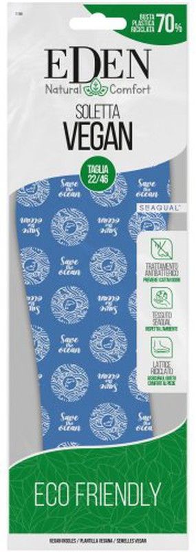 Plantilla Eco Friendly Vegana 22/46 de la marca EDEN Natural Comfort, ideal para adultos que buscan comodidad y sostenibilidad. Diseño azul con estampado circular y detalles en verde, libre de látex y testado dermatológicamente. Embalaje ecológico con tratamiento antibacteriano. Perfecta para uso diario y cuidado del pie.