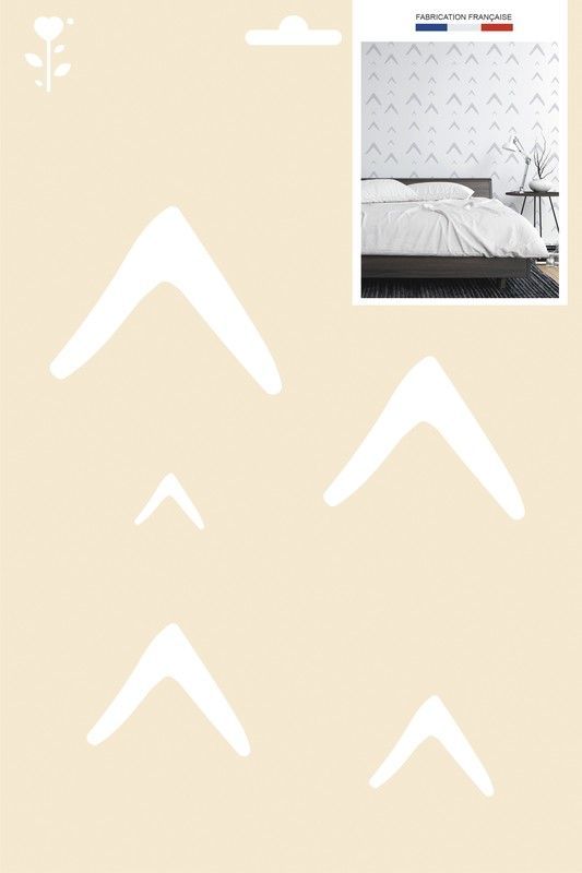 Plantilla de manualidades A4 con diseño de flechas en blanco sobre fondo beige. Ideal para decorar paredes, crear patrones geométricos o proyectos DIY. Fabricación francesa, calidad garantizada. Perfecta para amantes del arte y la decoración casera.
