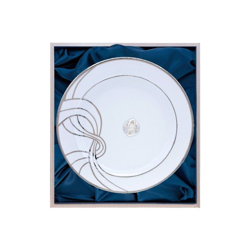 Plato conmemorativo de 29 cm ideal para celebraciones especiales como bodas o aniversarios. Fabricado en porcelana de alta calidad, presenta un elegante diseño de alianzas entrelazadas en tono plateado y detalles brillantes. Incluye caja de presentación con forro de terciopelo azul. Un regalo sofisticado y duradero para conmemorar momentos inolvida