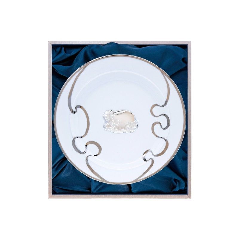 Plato conmemorativo de 29 cm ideal para celebrar bodas o aniversarios. Fabricado en porcelana de alta calidad con detalles metálicos plateados en forma de arabescos y una figura central de dos anillos entrelazados. Presentado en elegante caja con forro de terciopelo azul. Un regalo sofisticado y duradero para parejas que valoran la elegancia y el s