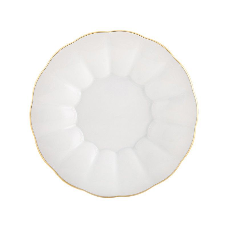 Plato de pan de porcelana blanca con elegante borde dorado, ideal para servir pan o acompañamientos en comidas especiales. Diseño clásico con surcos radiales que aportan sofisticación. Perfecto para decorar tu mesa con estilo y calidad duradera. Medidas: 17,5 x 17,5 x 2,3 cm.