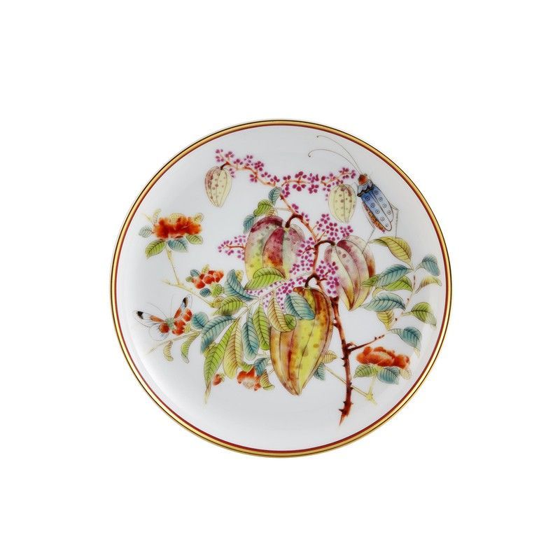 Plato de pan de porcelana de Paço Real con diseño floral tropical, ideal para decorar tu mesa con estilo. Con acabado dorado y motivos de hojas, flores y frutos de cacao, aporta un toque elegante y natural a tus comidas. Perfecto para uso diario o ocasiones especiales.