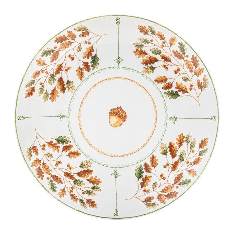 Plato de postre de porcelana blanca con elegante diseño de hojas de roble en tonos marrones y verdes, detalles dorados y un belloto central. Ideal para servir postres o como pieza decorativa en tu mesa. Calidad premium, acabado fino y diseño clásico que aporta sofisticación a cualquier comedor.