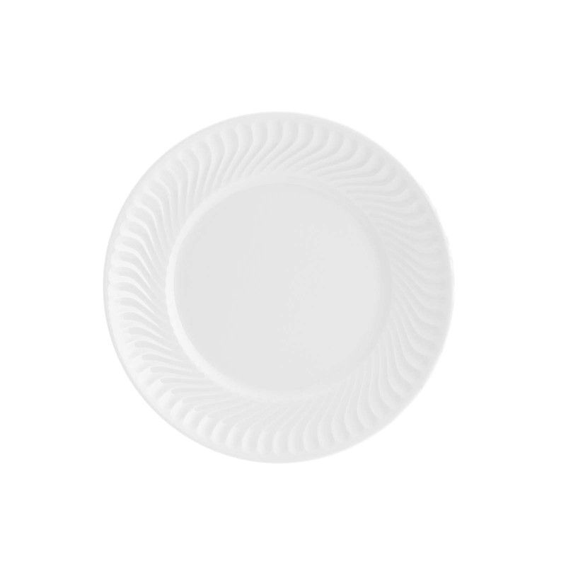Plato de postre de porcelana en blanco, con elegante diseño ondulado en el borde. Diámetro de 21,9 cm, ideal para servir postres, entrantes o como plato decorativo. Su acabado brillante y calidad de porcelana lo convierten en una pieza sofisticada para cualquier mesa. Perfecto para uso diario o ocasiones especiales.