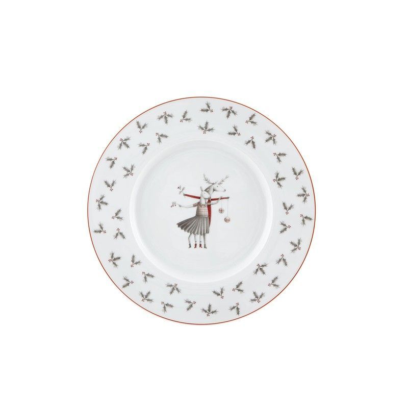 Plato de postre de porcelana con diseño artístico y elegante, ideal para decorar tu mesa en Navidad o cualquier ocasión especial. Con acabado en blanco, rojo y negro, presenta una figura central con cuernos y detalles festivos, rodeada de un borde con motivos repetitivos. Perfecto para servir postres o como pieza decorativa en tu vajilla.