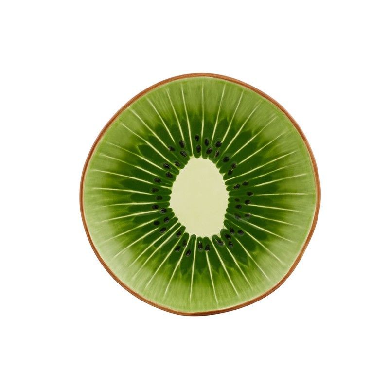 Plato de postre de loza con diseño tropical de kiwi, ideal para servir dulces o frutas. Su acabado realista en verde y marrón aporta un toque natural y divertido a tu mesa. Perfecto para amantes de la decoración con frutas tropicales y comidas con estilo.