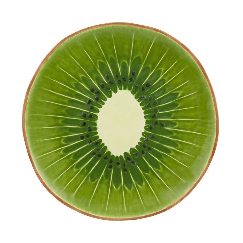Plato de presentación de loza con diseño tropical de kiwi, ideal para servir frutas, postres o aperitivos con estilo. Su acabado realista y colores vibrantes aportan un toque natural y sofisticado a tu mesa. Perfecto para amantes de la decoración con motivos de frutas tropicales.