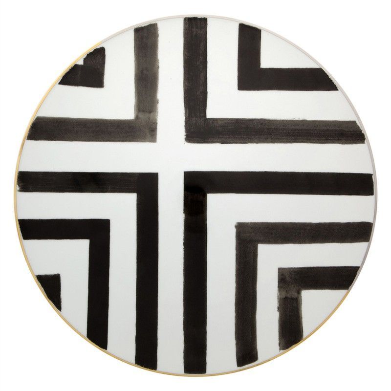 Plato de presentación de porcelana de 33,7 cm de diámetro con diseño geométrico en blanco y negro, borde dorado. Ideal para servir entrantes, postres o como pieza decorativa en tu mesa. Su acabado elegante y moderno lo convierte en un accesorio sofisticado para cualquier ocasión. Perfecto para cocinas y comedores con estilo contemporáneo.