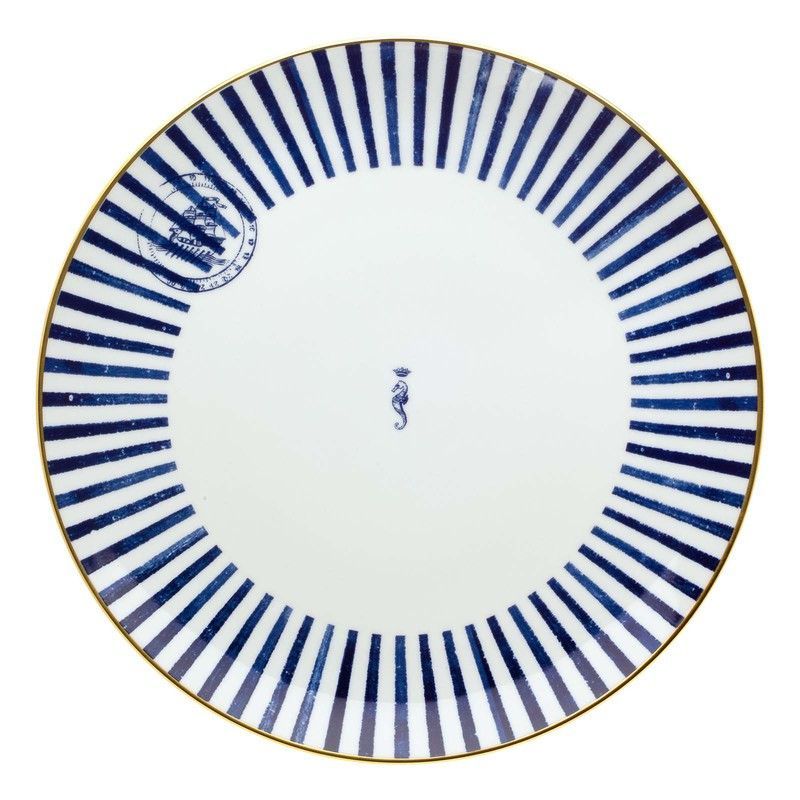 Plato de presentación de porcelana de alta calidad, ideal para servir platos principales o postres con estilo. Con diseño elegante de rayas azules radiales y borde dorado, aporta un toque sofisticado a tu mesa. Perfecto para ocasiones especiales o uso diario en hogares con gusto por la vajilla clásica y refinada.