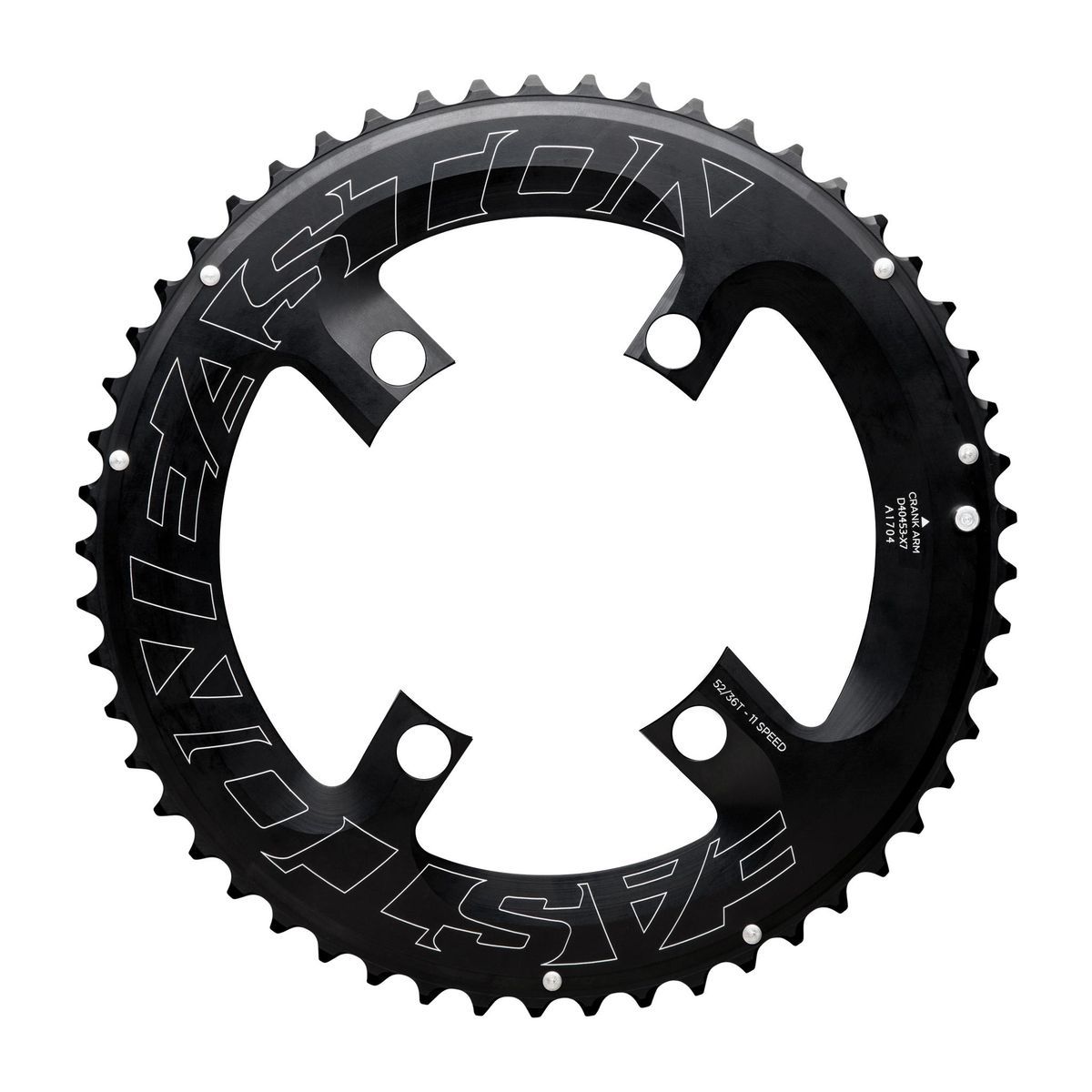 Plato exterior de bicicleta de 52 dientes, fabricado en acero inoxidable para mayor resistencia y durabilidad. Diseño optimizado para sistemas de 2x11 velocidades, con acabado negro mate y logotipo en relieve. Ideal para ciclistas que buscan rendimiento y precisión en sus cambios de marcha. Compatible con componentes de alta gama.