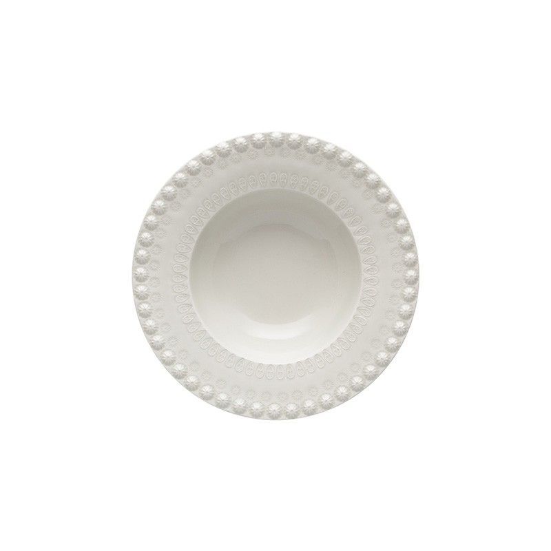 Plato hondo de loza en blanco, ideal para servir sopas, cremas o guisos con estilo. Con un borde decorado con perlas en relieve, aporta un toque elegante a tu mesa. Fabricado en loza de calidad, resistente y fácil de limpiar. Perfecto para ocasiones especiales o uso diario en tu hogar.