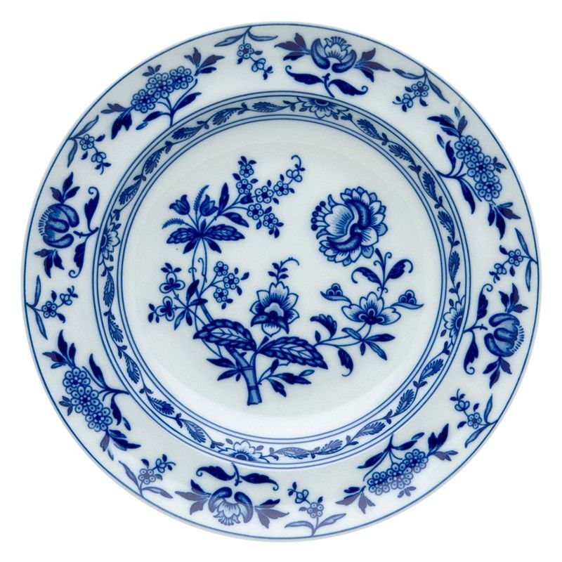 Plato hondo de porcelana con elegante diseño floral en azul sobre fondo blanco, ideal para servir comidas con estilo clásico. Fabricado en porcelana de alta calidad, presenta un borde decorado con motivos vegetales y un centro con flores y hojas en estilo tradicional. Perfecto para uso diario o ocasiones especiales, aporta un toque sofisticado a tu