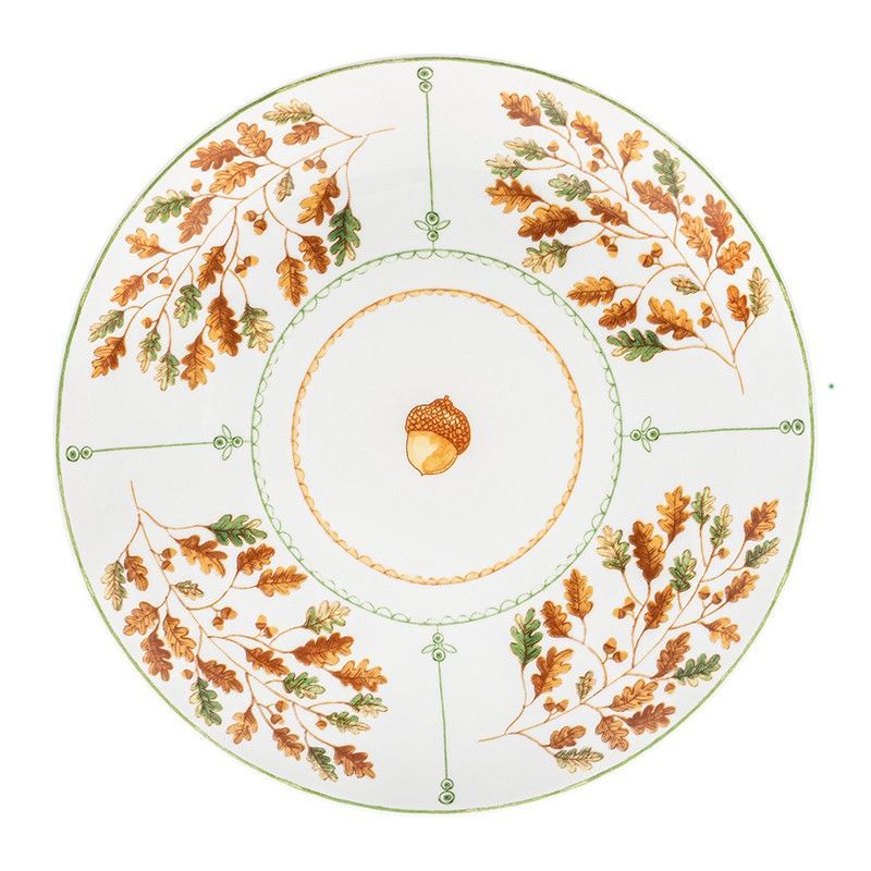 Plato hondo de porcelana blanca con elegante diseño de hojas de roble en tonos marrones y verdes, detalles dorados y una bellota en el centro. Ideal para servir comidas con estilo y sofisticación. Perfecto para decorar tu mesa en ocasiones especiales o diarias. Calidad duradera y acabado refinado.