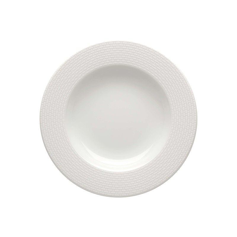 Plato hondo de porcelana en blanco, ideal para servir sopas, cremas o guisos con estilo. Con un borde texturizado que imita tejido trenzado y una superficie interior lisa y brillante, aporta elegancia a cualquier mesa. Perfecto para uso diario o ocasiones especiales. Medidas: 23,3 x 23,3 x 3,2 cm.