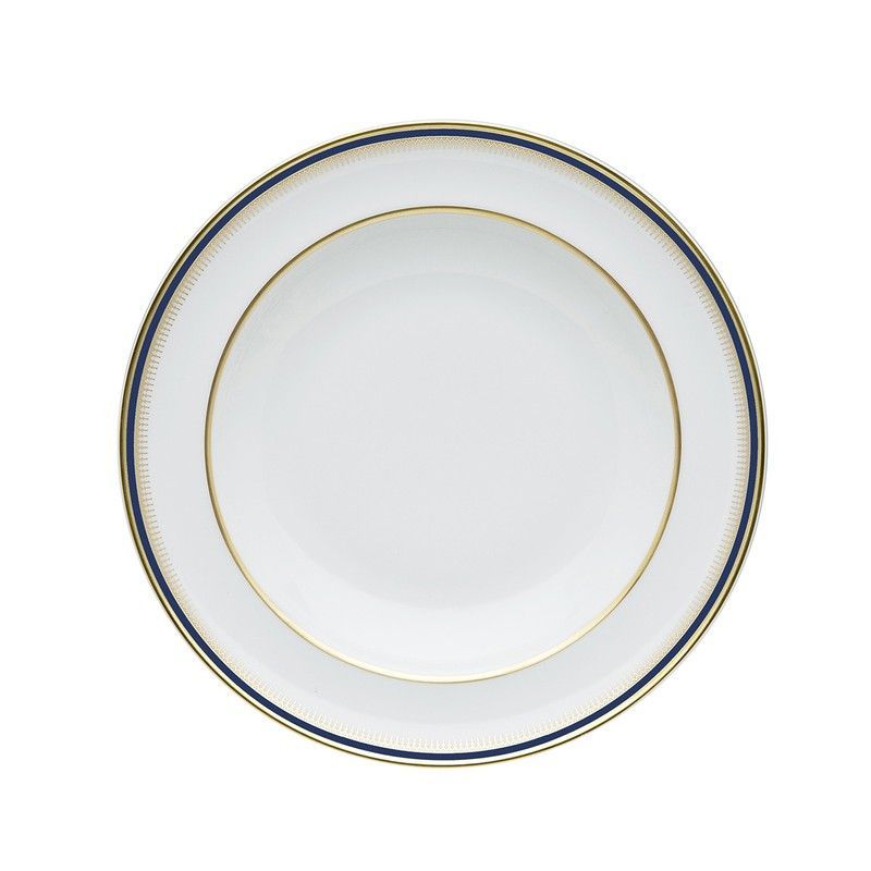 Plato hondo de porcelana de alta calidad en blanco, con detalles en azul y dorado. Diseño clásico y elegante ideal para comidas formales o diarias. Perfecto para servir sopas, guisos o postres con estilo. Fabricado por Cambridge, garantiza durabilidad y sofisticación en tu mesa.