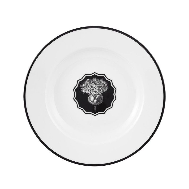 Plato hondo de porcelana blanca con elegante diseño botánico en negro, ideal para comidas sofisticadas. Con borde negro y decoración central inspirada en herbarios, aporta un toque de estilo natural y refinado a tu mesa. Perfecto para uso diario o ocasiones especiales.
