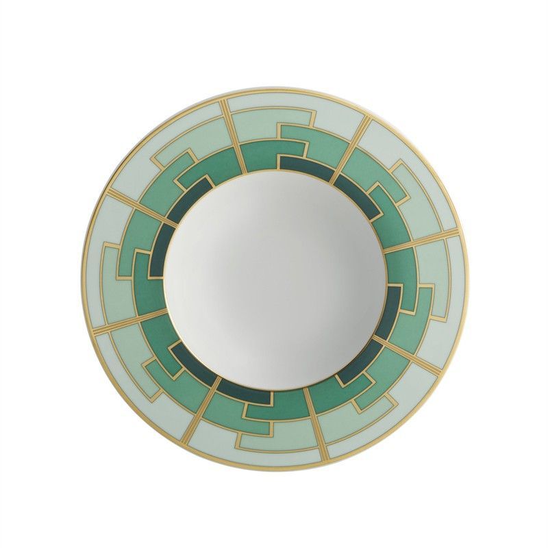 Plato hondo de porcelana en tonos verde esmeralda y blanco con detalles dorados, ideal para servir comidas elegantes. Diseño geométrico sofisticado que aporta un toque de estilo a tu mesa. Perfecto para ocasiones especiales o uso diario en cocina y comedor.