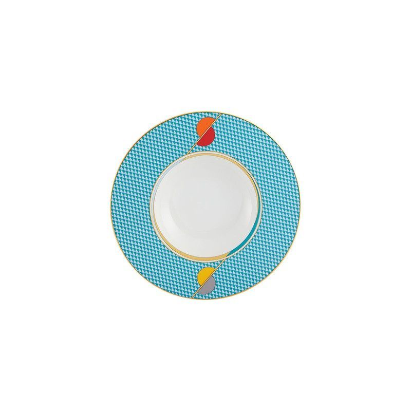 Plato hondo de porcelana con diseño futurista, ideal para comidas elegantes o diarias. Su borde azul con patrón geométrico y detalles en colores vivos aporta un toque moderno y sofisticado a tu mesa. Fabricado en porcelana de alta calidad, resistente y fácil de limpiar. Perfecto para amantes del diseño contemporáneo que buscan funcionalidad y estil