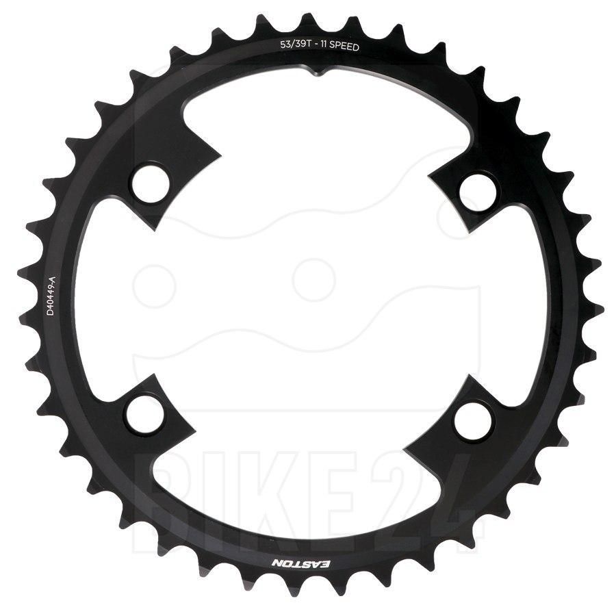 Plato interior de bicicleta de 39 dientes para sistemas 2x11 velocidades, fabricado en acero inoxidable de alta resistencia. Diseño negro mate con 4 orificios para tornillos, ideal para ciclistas que buscan rendimiento y durabilidad en sus componentes de transmisión. Compatible con sistemas de 11 velocidades, perfecto para ciclismo de carretera y e