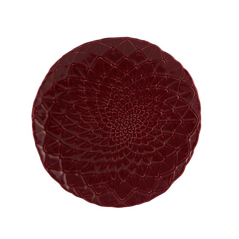 Plato llano de loza en color granate, ideal para servir comidas con estilo y elegancia. Su diseño texturizado en forma de flor aporta un toque decorativo a cualquier mesa. Fabricado en loza de calidad, resistente y fácil de limpiar. Perfecto para uso diario o ocasiones especiales en el comedor.