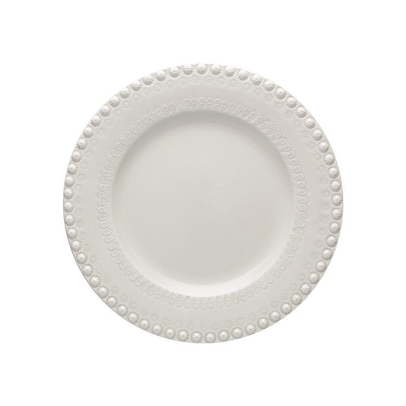 Plato llano de loza en blanco, ideal para servir comidas con estilo y elegancia. Con un borde decorado con perlas en relieve, aporta un toque sofisticado a tu mesa. Perfecto para ocasiones especiales o uso diario en casa. Fabricado en loza de calidad, resistente y fácil de limpiar. Dimensiones: 29 x 29 x 2,5 cm.