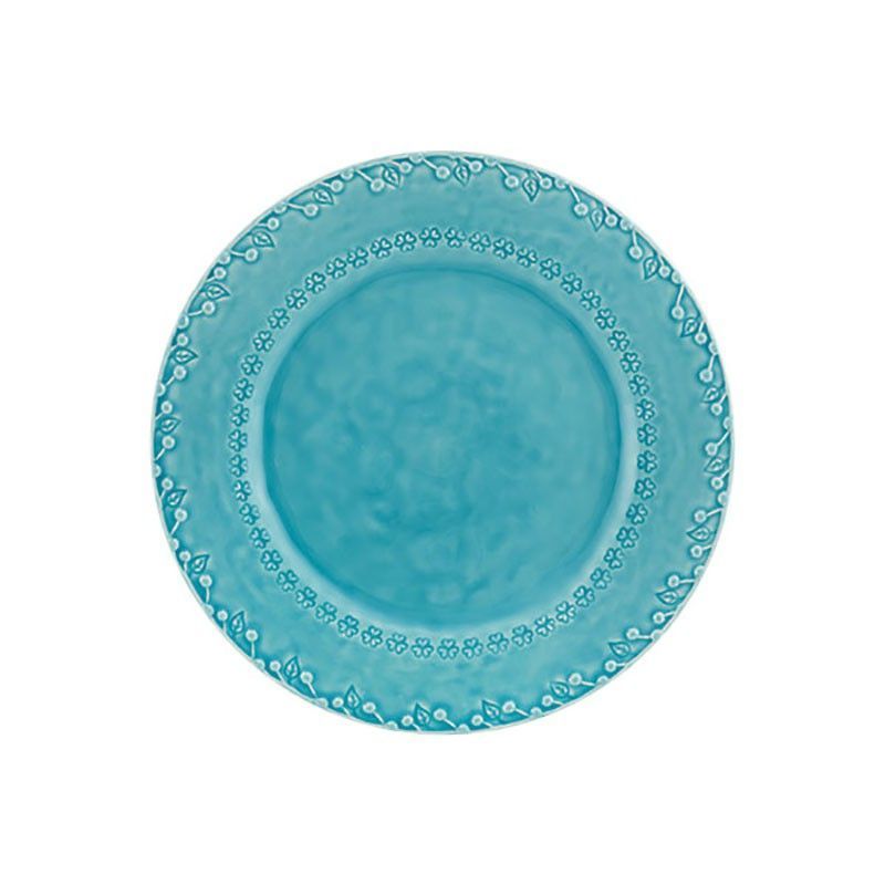 Plato llano de loza en color turquesa, ideal para decorar tu mesa con estilo. Con un diseño floral en relieve en el borde, aporta un toque elegante y sofisticado a cualquier comedor. Fabricado en loza de calidad, resistente y fácil de limpiar. Perfecto para uso diario o ocasiones especiales. Dimensiones: 29 x 29 x 3,2 cm. Ideal para adultos que bus