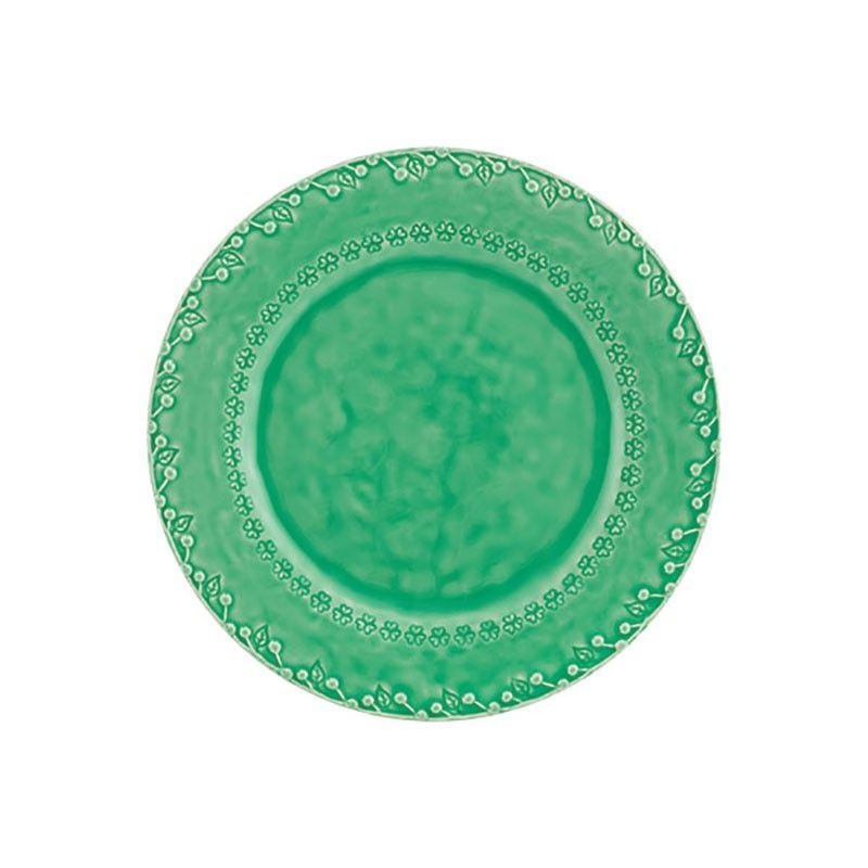 Plato llano de loza en verde, ideal para servir comidas con estilo y elegancia. Con un diseño floral en relieve en el borde, aporta un toque clásico a tu mesa. Fabricado en loza de calidad, resistente y fácil de limpiar. Perfecto para uso diario o ocasiones especiales. Dimensiones: 29 x 29 x 3,2 cm.