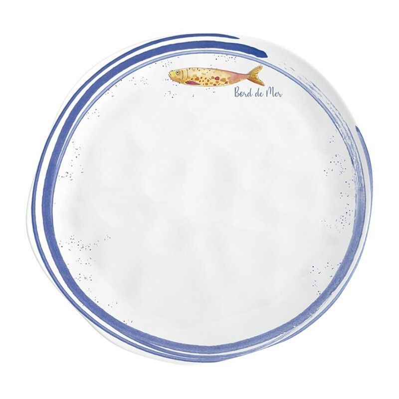 Plato llano de porcelana con diseño náutico en blanco y azul, ideal para servir comidas con estilo mediterráneo. Decorado con un pez y el texto 'Bord de Mer', perfecto para amantes de la cocina y la decoración costera. Calidad duradera y elegante para uso diario o ocasiones especiales.