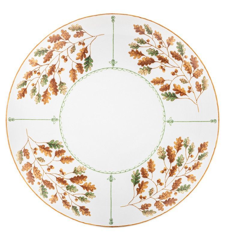 Plato llano de porcelana de alta calidad, ideal para servir comidas con estilo. Diseño elegante con motivos de hojas de roble en tonos marrones y verdes, detalles dorados y líneas decorativas verdes. Perfecto para mesas de comedor sofisticadas o ocasiones especiales. Medidas: 27,6 x 27,6 x 3,4 cm.