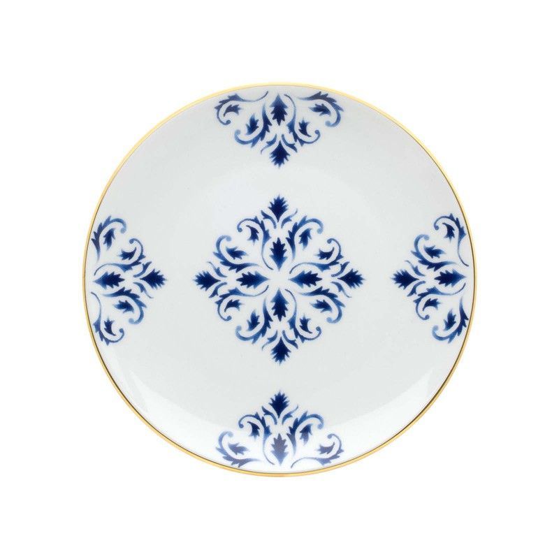 Plato pan de porcelana Transatlântica con elegante diseño azul y borde dorado. Ideal para servir pan o como complemento decorativo en tu mesa. Su acabado fino y detalles ornamentales lo convierten en una pieza sofisticada para cualquier ocasión. Diámetro 16,2 cm.