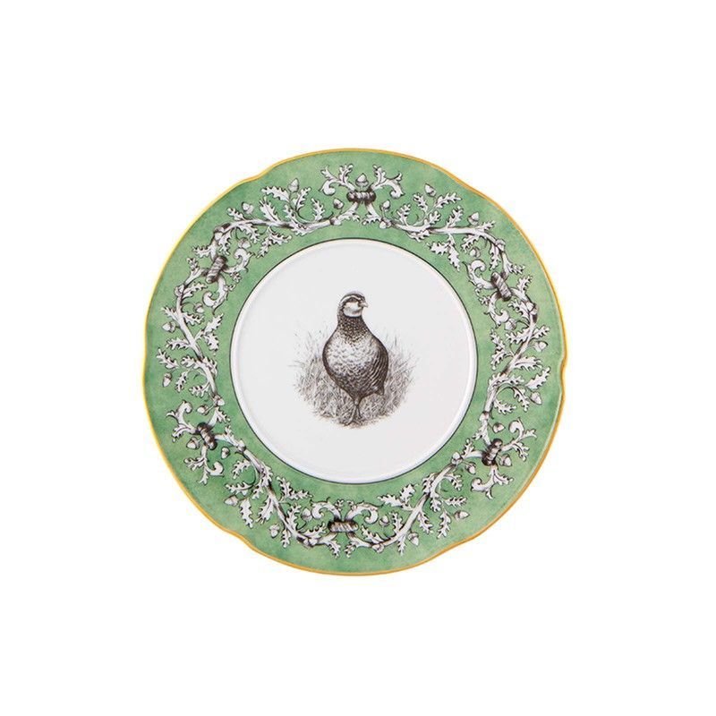 Plato postre de porcelana Casa de Alba con elegante diseño de perdiz en el centro y borde decorado con motivos vegetales en verde y blanco. Ideal para servir postres o como pieza decorativa en tu mesa. Calidad premium, acabado dorado y detalles refinados para un toque sofisticado en tu vajilla.