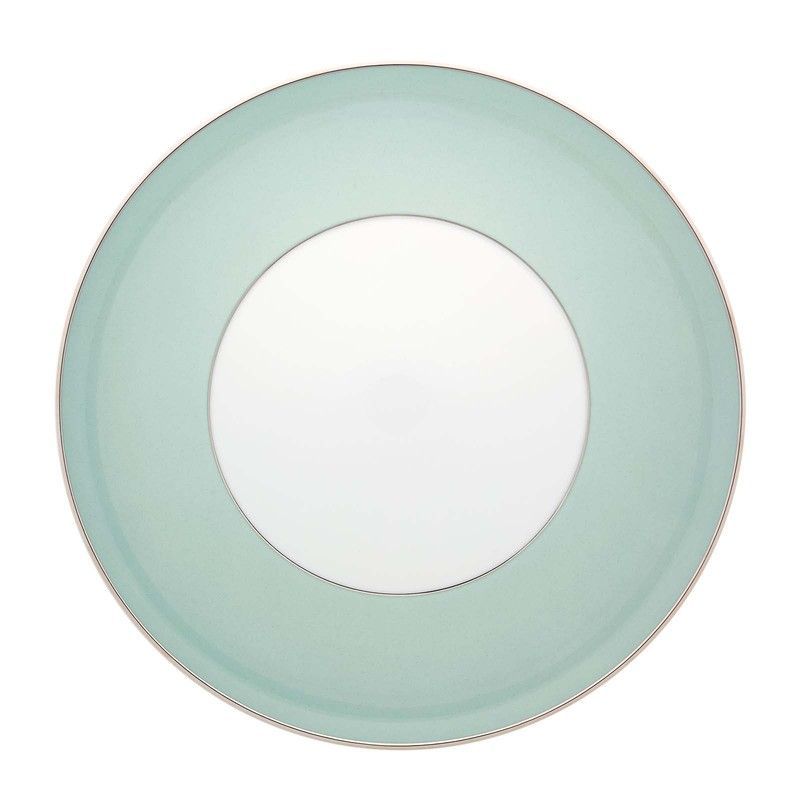 Plato de presentación en porcelana Venezia, con diseño elegante y acabado pulido. Ideal para servir platos principales o postres con estilo. Su borde verde claro y centro blanco aportan un toque sofisticado a cualquier mesa. Perfecto para ocasiones especiales o uso diario en hogares que valoran la calidad y el diseño.