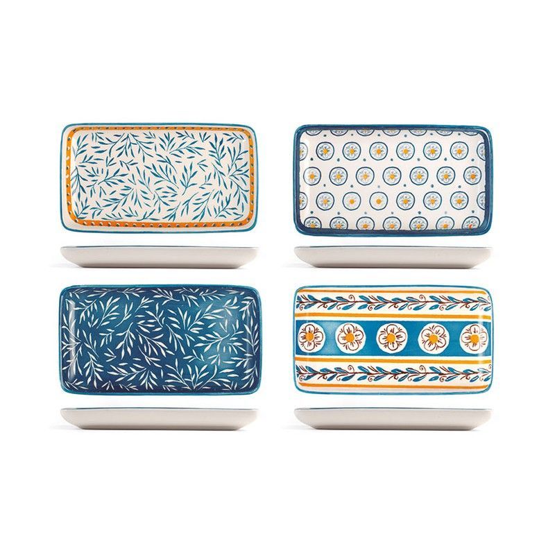 Plato rectangular de cerámica con diseño decorativo inspirado en estilos mediterráneos. Ideal para servir entrantes, postres o como plato de presentación. Combina elegancia y funcionalidad con motivos florales, geométricos y hojas en tonos azules, blancos y naranjas. Perfecto para decorar tu mesa con un toque artesanal y sofisticado.
