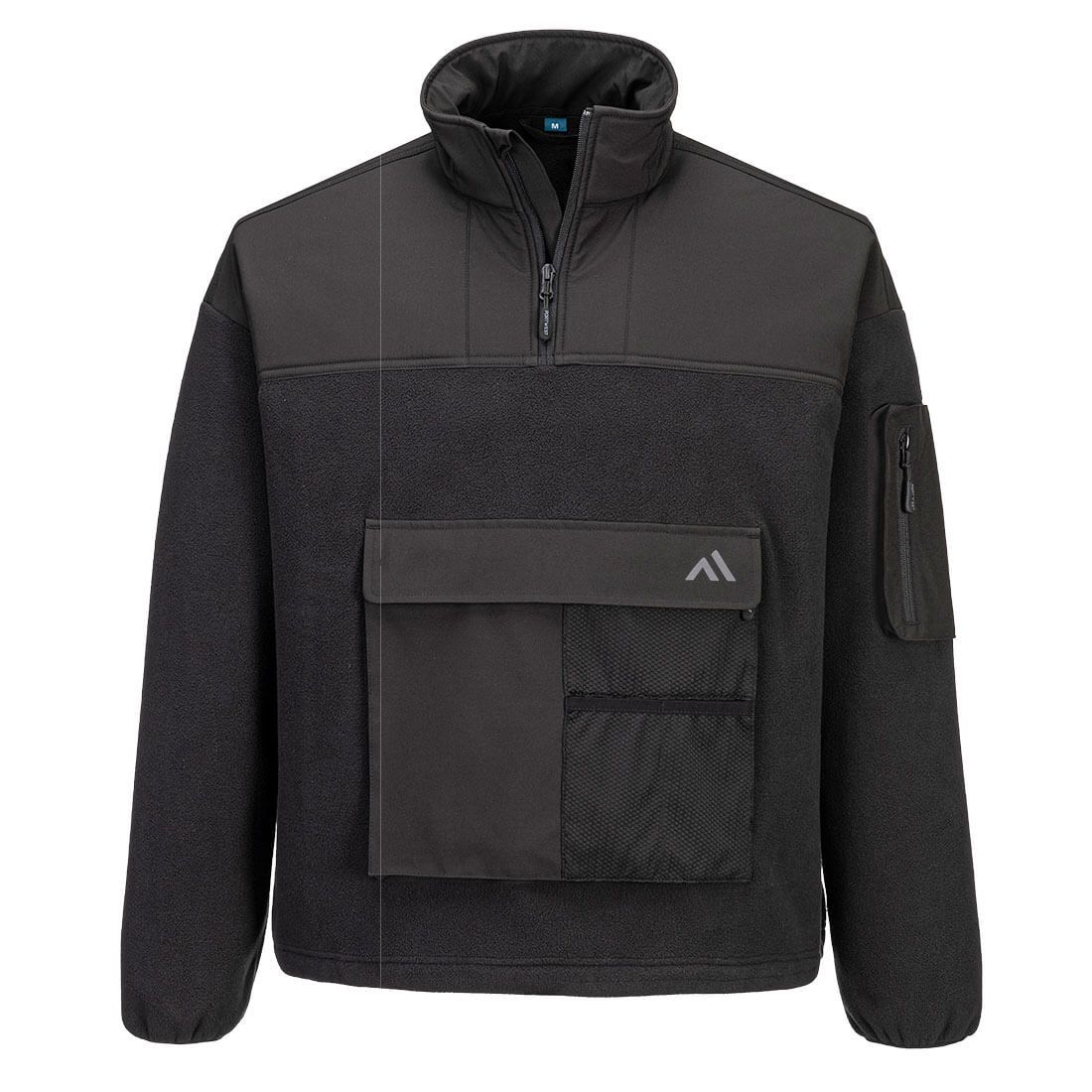 Polar KX3 con cremallera 1/4 en negro y gris oscuro, ideal para actividades al aire libre. Confeccionado en poliéster y tejido polar de alta calidad, ofrece comodidad y calidez. Cuenta con bolsillos funcionales, incluyendo uno con cremallera en el brazo y otro frontal con panel de malla. Diseño técnico y resistente, perfecto para adultos que buscan