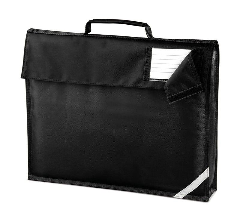 Porta documentos negro de poliéster resistente, ideal para profesionales y estudiantes. Cuenta con asa superior, cierre con velcro y ventana transparente para etiqueta. Detalle reflectante para mayor visibilidad. Diseño funcional y elegante para llevar documentos de forma segura y organizada.