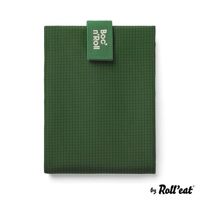 Portabocadillo Boc'n'Roll Active en color verde, fabricado en poliéster resistente con diseño cuadriculado. Ideal para llevar el almuerzo o bocadillos de forma práctica y elegante. Su textura de malla fina y cierre con etiqueta lo hacen perfecto para el uso diario en la oficina, escuela o viajes. Mantén tus alimentos frescos y organizados con estil