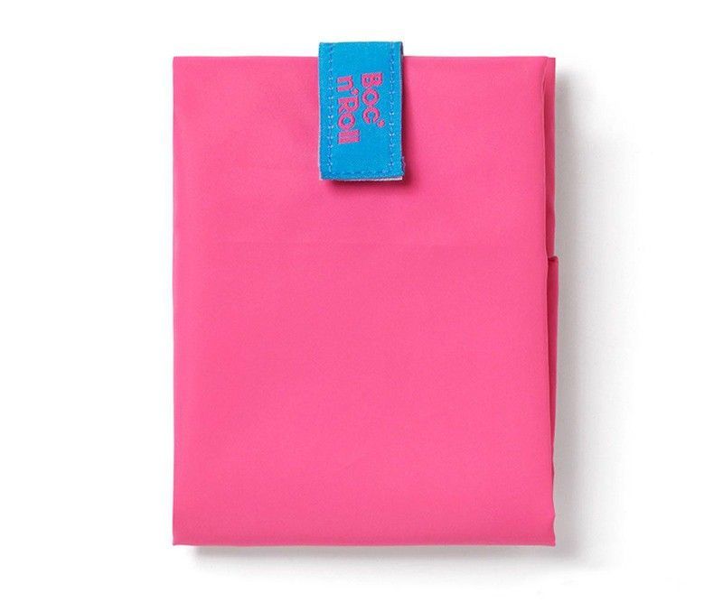 Portabocadillo Boc'n'Roll en color rosa fluor, ideal para llevar alimentos al trabajo o al colegio. Fabricado en lona resistente y con cierre seguro mediante solapa con etiqueta azul. Diseño compacto y moderno, perfecto para mantener tus bocadillos frescos y organizados. Ideal para adultos y niños que buscan una solución práctica y estética para el