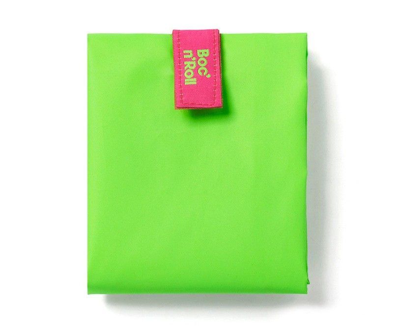Portabocadillo Boc'n'Roll en color verde fluorescente, ideal para llevar alimentos al trabajo, escuela o excursiones. Fabricado en lona resistente y con cierre seguro, mantiene tus bocadillos frescos y organizados. Su diseño compacto y moderno lo convierte en un accesorio práctico y atractivo para adultos y niños. Incluye etiqueta rosa con logo dor