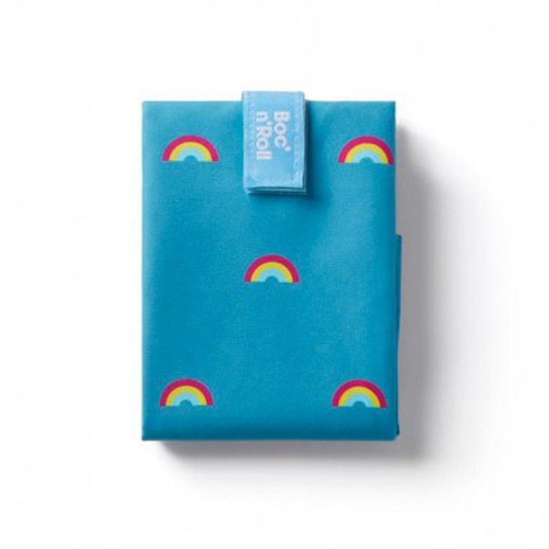 Portabocadillo Boc'n'Roll Icons Arco Iris, ideal para llevar el almuerzo con estilo. Fabricado en poliéster resistente, presenta un diseño divertido con arcoíris multicolor sobre fondo azul. Perfecto para niños y adultos que buscan una solución práctica y colorida para sus comidas diarias. Cierre seguro con solapa para mantener los alimentos fresco
