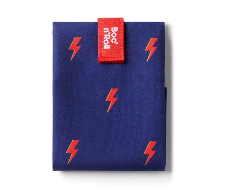 Portabocadillo Boc'n'Roll Icons Tormenta, ideal para llevar el almuerzo con estilo. Fabricado en lona resistente, presenta un diseño llamativo con rayos rojos sobre fondo azul. Perfecto para estudiantes, trabajadores o amantes del diseño urbano que buscan funcionalidad y originalidad en su rutina diaria.