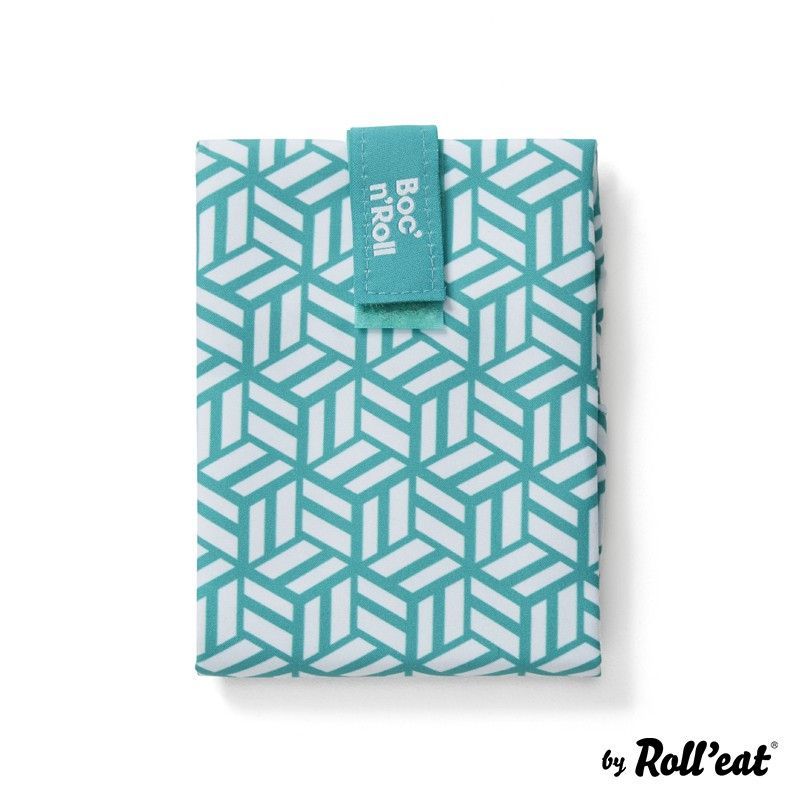 Portabocadillo Boc'n'Roll Tiles Verde, ideal para llevar alimentos frescos al trabajo o al colegio. Con diseño geométrico en tonos verde y blanco, fabricado en poliéster resistente y cierre de goma para mayor comodidad. Perfecto para mantener tus bocadillos y snacks frescos y organizados durante todo el día.