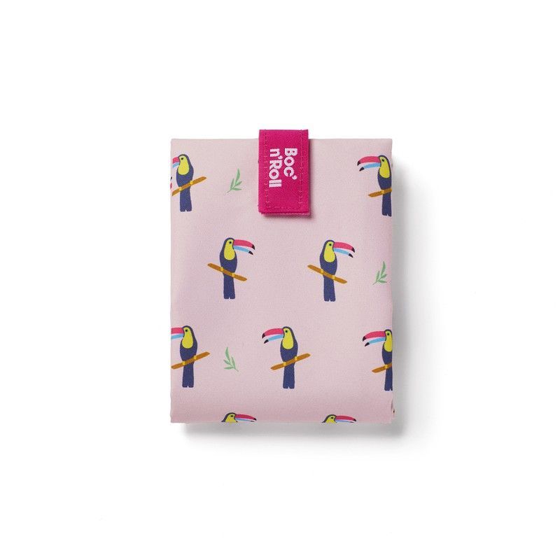 Portabocadillos Boc'n'Roll Animals Tucán con estampado tropical de tucanes coloridos sobre fondo rosa. Fabricado en poliéster resistente y lavable, ideal para llevar el almuerzo con estilo. Perfecto para niños y adultos que buscan una bolsa práctica, ecológica y divertida para el colegio, la oficina o las salidas al aire libre.